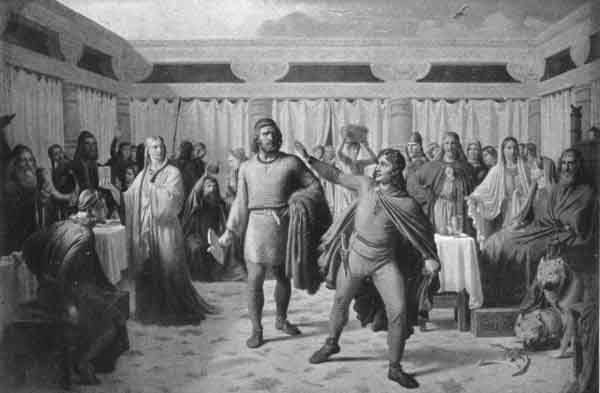 Into the feasting-chamber they strode, where people sat drinking, and dragged Grendel's head along the floor. . . . An awesome sight was that to the nobles and the queen who sat with them. In silence the warriors gazed upon the monstrous head, wondering greatly.