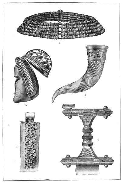 1. Gold Collar from Oland. 2. Masked Helmet from Thorsbjerg Moss. 3. Drinking-horn. 4. Portion of a Damascened Sword from Nydam. 5. Bronze Sword Grip decorated with gold and garnets.